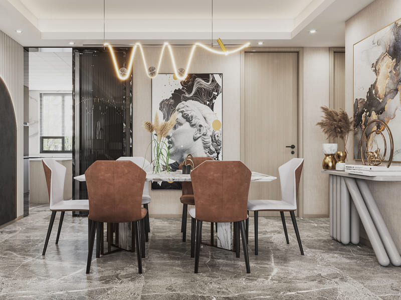 4、开放式的餐厅,我们可以使用隔断来与其他空间进行划分,这样就餐氛围会更好,要不然吃饭的时候会感觉旁边很空旷,没有安全感。