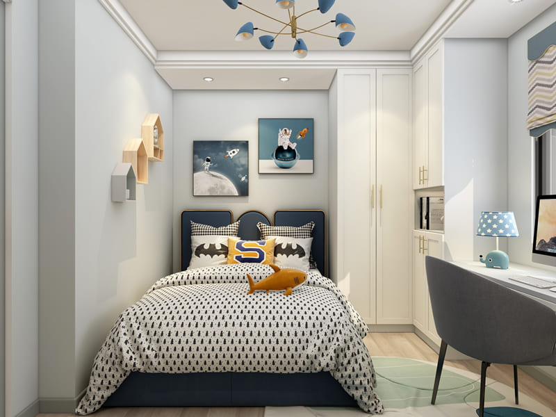 儿童房家具安全是一定要考虑的,选择有隔板和围栏就可以,床、桌椅、衣柜要耐用和好清洗。