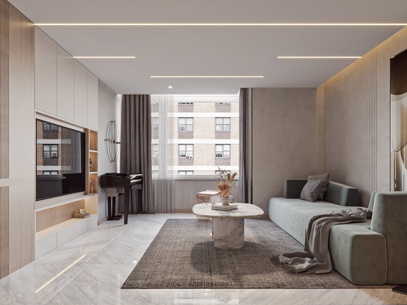 无主灯设计主观上就会显得空间非常通透立整,没有吊灯繁杂的装饰与局部的压迫感,给人一种一眼就望到尽头明朗的氛围。