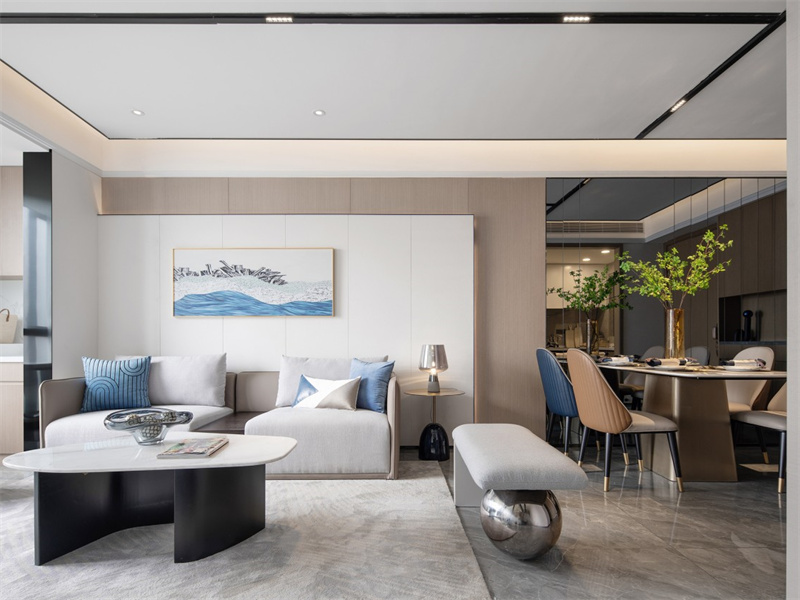 在冷色调中,加入少面积的暖调金色,形成冷暖的碰撞,居室变得很有味道,反之也可。如果担心无法拿捏尺度,同色调金属的不同饰面,亮光面配比哑光面,也能形成反差。
