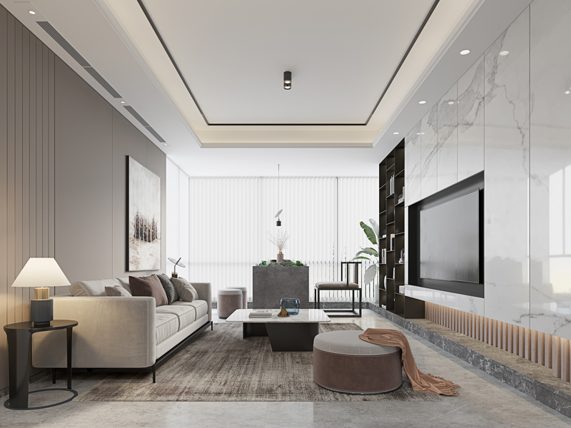客厅整体做到颜色统一相近,为整体效果做好铺垫,软装家具的选择十分简洁,摒弃了繁杂的配饰,避免杂乱,无主灯设计为空间增添一份治愈的氛围感,使人身处其中十分惬意舒适。