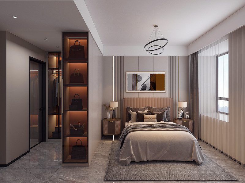 这个搭配近些年来越来越流行,主卧室有卫生间,正对着床。为了解决尴尬,在中间装了一个衣柜。一方面,看不到卫生间,另一方面,衣柜和卫生间门之间也可以有多个步入式衣帽间,这是一种一举多得的做法。