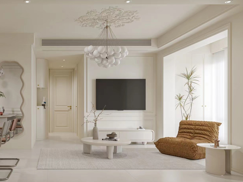 客厅空间整体配色的定位上要选用低饱和度色彩,例如奶咖、奶白、浅灰等作为主色调通过低饱和度的咖色进行局部的点缀,更显温馨。本案例灯光设计以设计感主灯设计为主,加以手边辅助照明,用射灯相对简洁的灯光搭配设计进行氛围感的呈现,避免厚重感。