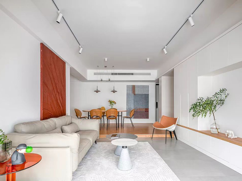 本案例风格定位于活力简约风,通过色块的点缀,活力满满。功能上通过大量收纳柜,保证了空间的实用性。