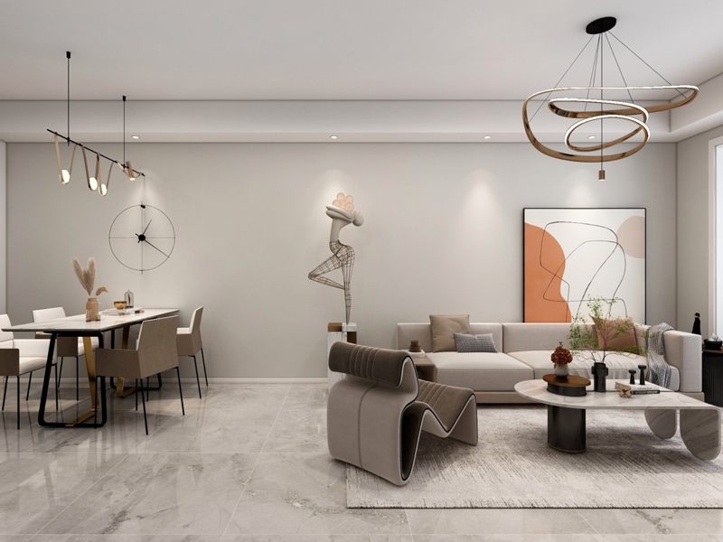 客厅与餐厅的格局以开放式设计,沙发旁边就是餐厅,简洁的餐厅桌椅搭配吊灯,整个客餐厅空间显得年轻而又时尚大方,饱满便捷。