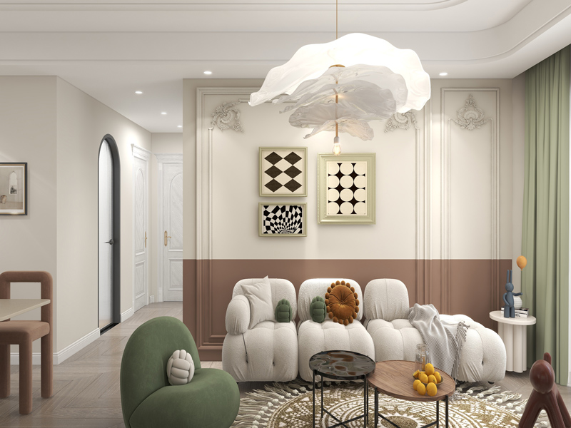 客厅设计的重点在于背景墙的撞色搭配与沙发窗帘等软装色系之间的相呼应,艺术灯饰提升空间时尚氛围。