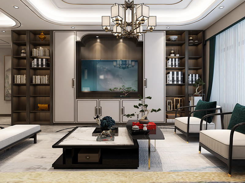 考虑到客厅空间储物能力有限,延续新中式设计基调的同时,巧用木材等装饰,将收纳设计融入电视背景墙。