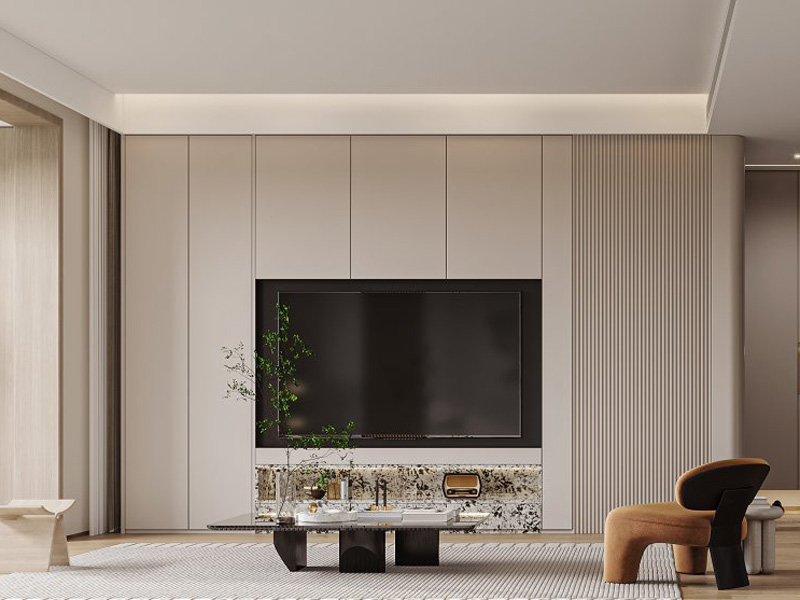 内嵌式电视设计搭配格栅影豹背景墙,增添空间层次感,与大理石材质碰撞融合,充满自然气息。
