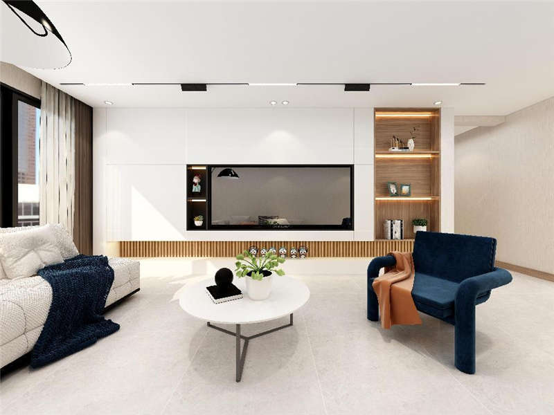 打造客厅收纳空间的常见做法是在电视背景墙区域设计整墙收纳柜,将电视机嵌入设计在柜体内。为了兼顾收纳与展示功能,建议按照“藏八露二”的原则设计收纳柜。