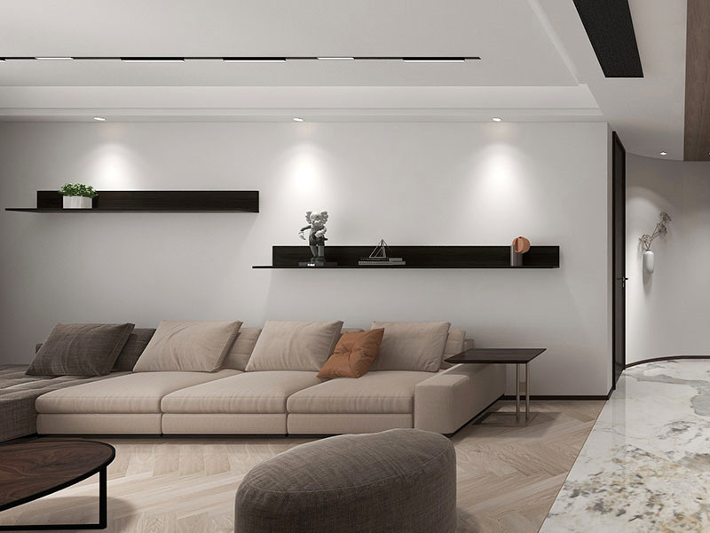 沙发背景墙采用简单墙漆装饰,用置物架做点缀,既彰显空间的极简美,又丰富客厅空间的储物能力。