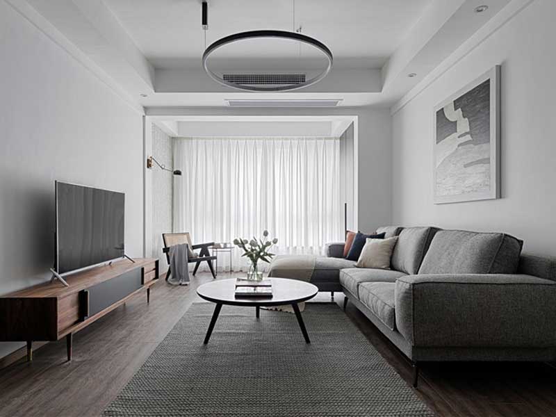 客厅空间采用木质与布艺相互碰撞,即使是冷色调也不会给人清冷的氛围,增加空间整体自然氛围。
