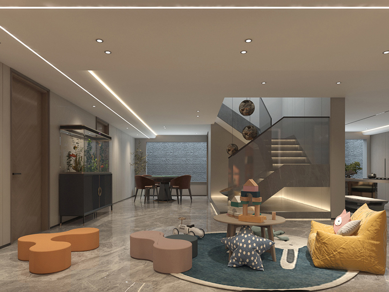 楼梯的位置通常处于较深处,那么在设计上需要考虑到采光的问题,可以通过添加隐藏灯带的方式来解决,既能提升空间氛围也可以满足采光需求。