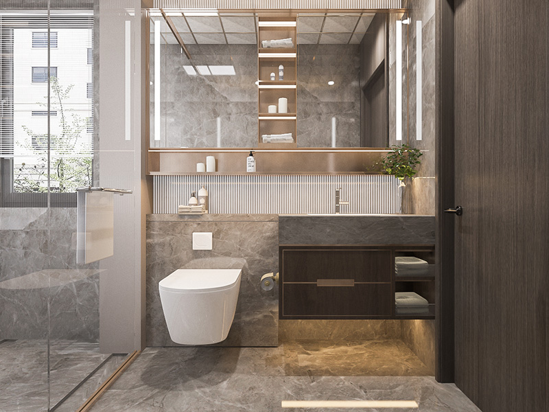 卫生间是用水量很大的功能空间,建议使用瓷砖、大理石等材质的装修材料装饰墙面和地面。同时要做好防水防滑、用电安全等设计。