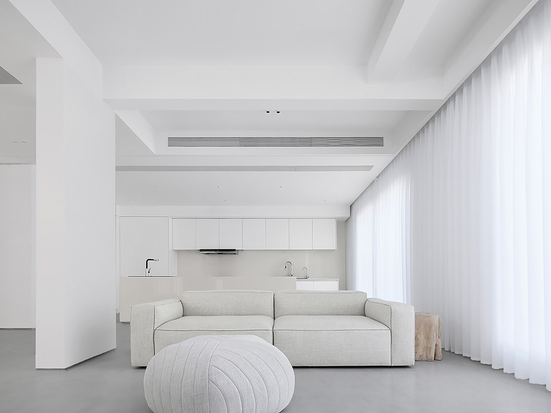 空间选用白色为主来进行设计,开放式的空间布局十分大气简洁,无主灯的灯光设计视觉上增添开阔感。
