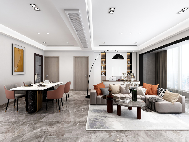 客厅空间的布局十分饱满,书房区域与餐厅区域的融入让客厅功能性更强,让整体视觉更大气时尚。