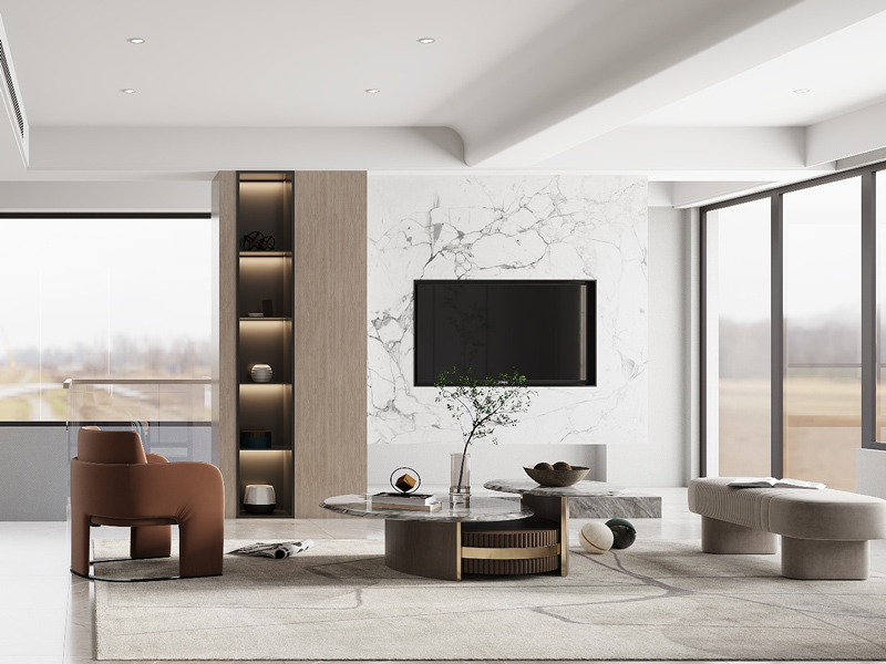 电视背景墙采用大理石与木质拼接设计,整体视觉自然舒适,落地窗的融入为空间纳入自然光线,明朗通透。
