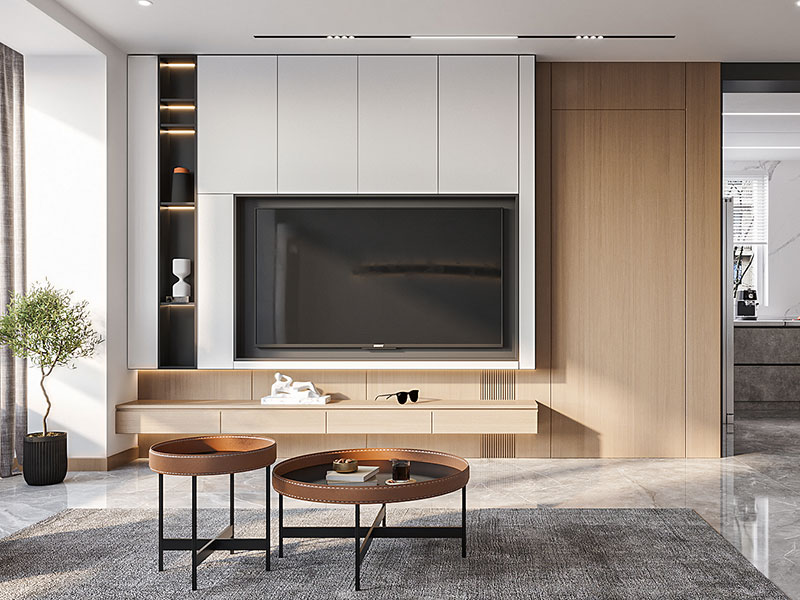 我们可以巧用客厅的墙面,用满墙式收纳柜等代替背景墙设计,收纳书籍和小件物品,让客厅也保持整洁有序。