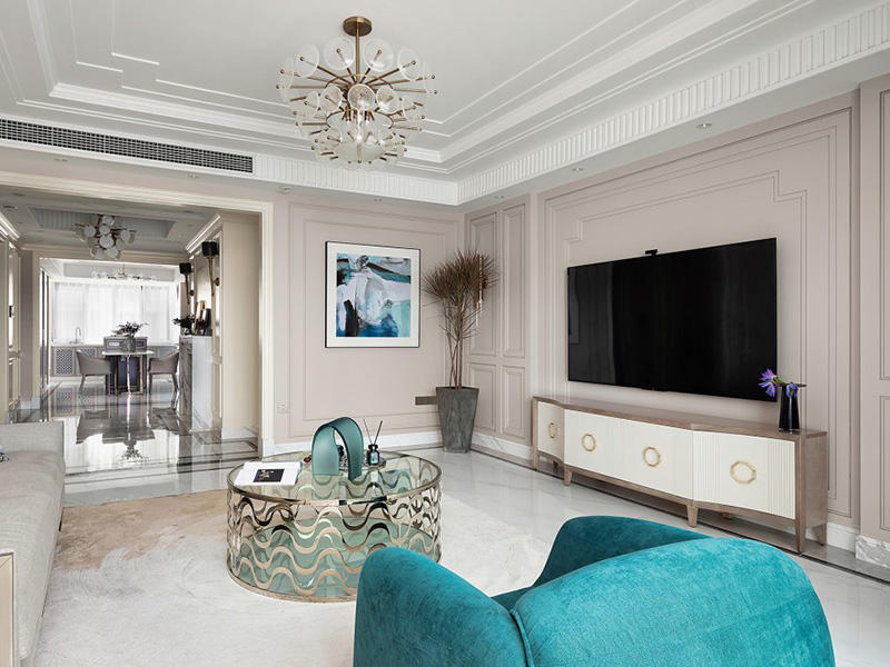 采用简约线条装饰墙面和屋顶,彰显空间的层次美。三段式布局的电视背景墙,拉伸客厅的视觉空间。家具造型简洁,局部用金属色点缀,诠释法式轻奢风格家居。