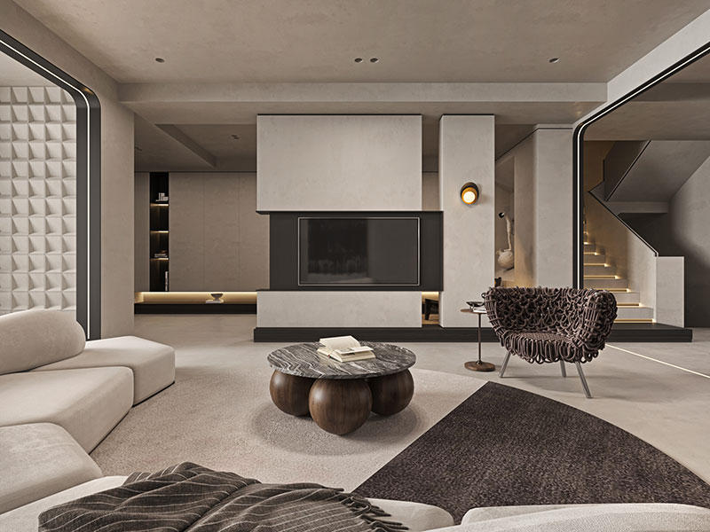 整体以浅灰色系装饰布局,搭配彰显几何美感的沙发、茶几等,并结合无主灯设计和柔和自然光线,诠释侘寂风家居的自然淳朴。