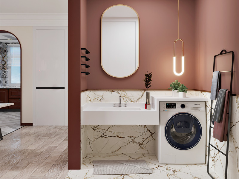一体盆也是一种卫生间洗脸盆的常见设计形式,它的盆体和台面是一体化设计的,多采用石材制作而成,没有缝隙,也没有卫生暗角,可以起到很好的防渗、防溅和防霉效果。