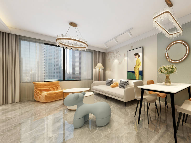 采用客餐厅一体化布局,用墙漆的色彩差异、家具和灯饰等,明确功能区域的划分,又不影响家居空间的宽敞通透。