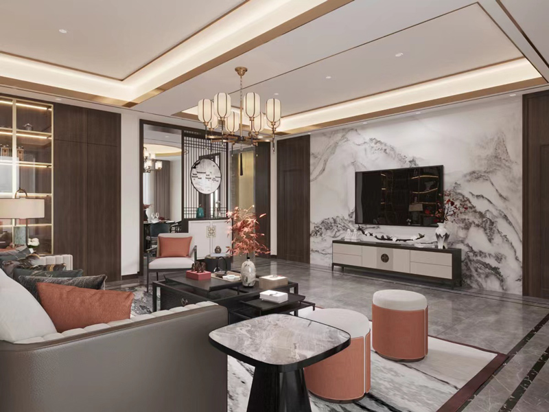 电视背景墙采用大理石材质的水墨画设计,提升客厅古典韵味,呈现出更为灵动的新中式空间效果。