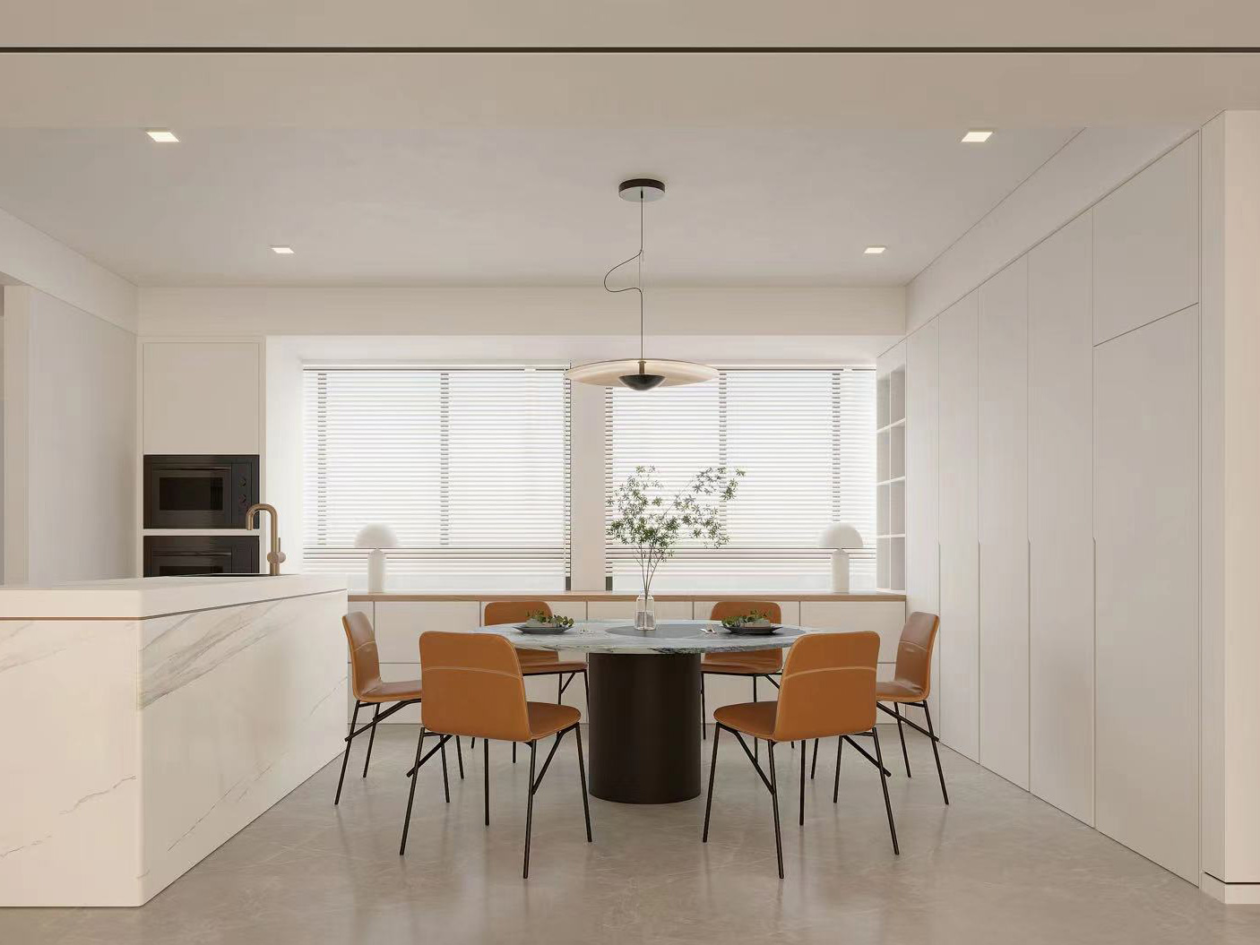 在餐厨空间中我们的操作是比较多的,需要考虑到家务的动线,例如厨房的烹饪流程,餐区与厨房的收纳距离,考虑到这两点我们就能得到一个舒适的餐厨空间。