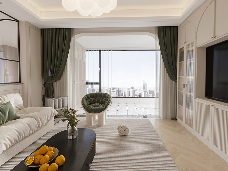 客厅整体以米白色为主,阳台扩入室内大气实用,更大限度将自然光线纳入客厅,明朗通透。