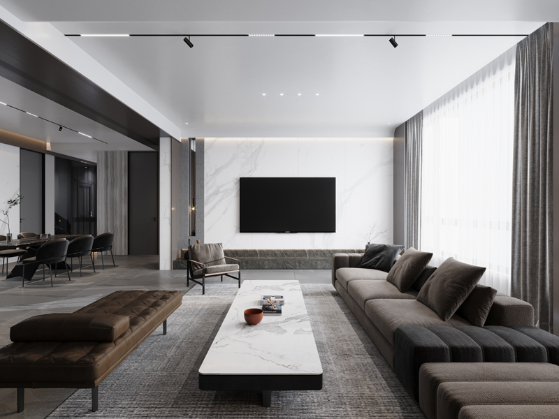 在色彩搭配上顶面尽量选择浅色,遵循“上浅下深”的原则,通常人的视觉重点更容易放在深色系上,以此掩盖层高的缺陷。