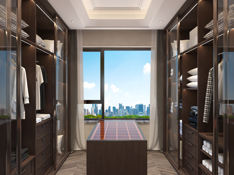 衣帽间采用双面柜体布局,更大限度的增加收纳空间,将柜门做成可视的,增加空间感,取用更方便。