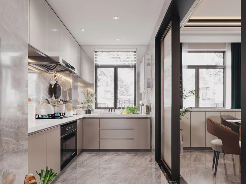 厨房采用“L”形的橱柜布局,简洁大气的色调搭配清爽自然,采用推拉门避免了油烟的外溢,保证生活体验感。