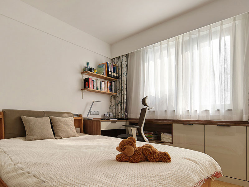 次卧相比于主卧增设了收纳区域,简约的家具选择以及留白设计,使空间呈现更显低调自然与温馨。