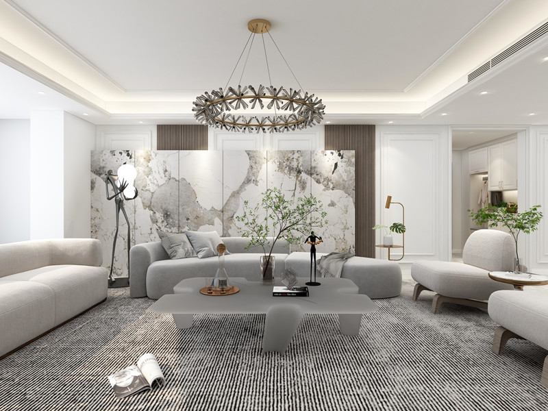 雅致的背景墙为空间带来复古气息,布艺沙发为空间带来舒适与惬意,两相结合满满的轻奢氛围,非对称设计时尚大方,融洽而不突兀的视觉美学。