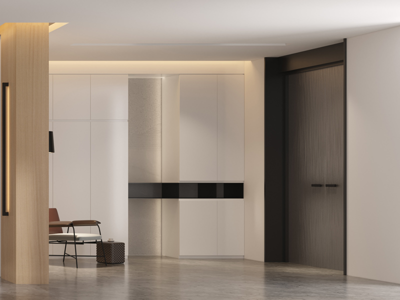 玄关整面简洁大气的黑白收纳柜,满足区域收纳需求,采用隔断让空间更独立,营造出安全感。