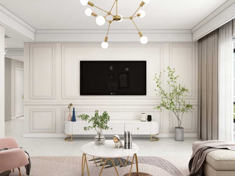客厅背景墙以单色为主,线条感石膏线为区域增添层次感,避免单调,绿植融入营造出清爽的氛围。