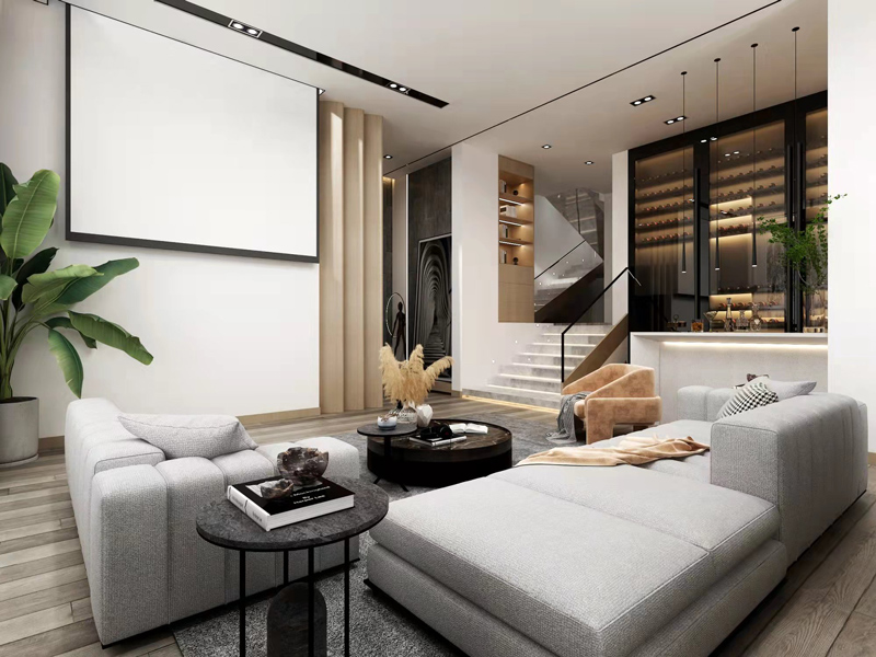 客厅区域采用下沉设计,增加了空间高度,使视觉上更大气明朗,赋予层次感,提升整体美观度。