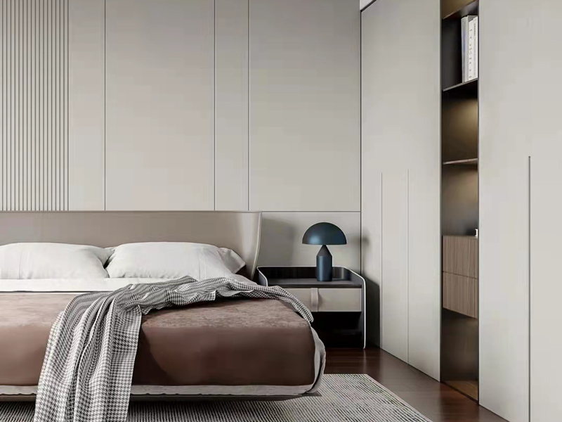 卧室整体色彩选择清爽淡雅,为环境营造自然舒缓基调,拼接背景墙与弧形床头造型构成视觉层次。