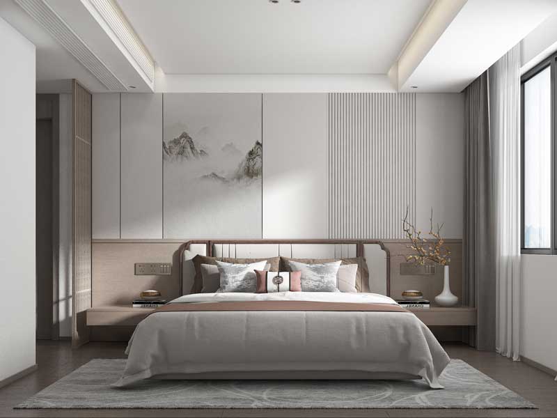 卧室简朴素雅,柔和的灯光营造出舒适的环境,拼接的背景墙中融入水墨画,整体风格更统一和谐。