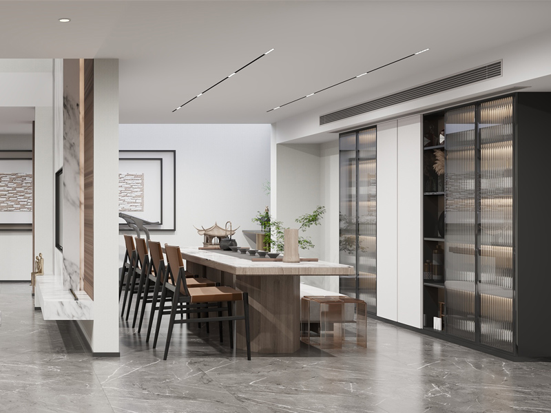 休闲茶室以开放式布局在空间中,赋予会客品茶松弛的氛围,背景墙采用整面收纳柜设计,保证区域收纳需求。