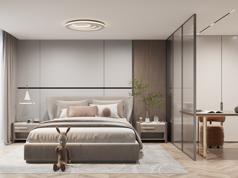 卧室采用隔断设计将空间分隔开,营造相对独立的睡眠与办公环境,布局更合理,提升生活体验感助于睡眠。