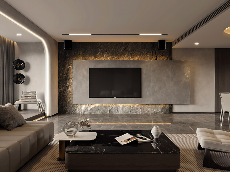 电视背景墙对应了沙发背景墙的色调,简洁的线条无需太多的装饰,粗糙的石材纹理对应细腻的石板,光影结合下带来视觉上的反差美学感受。