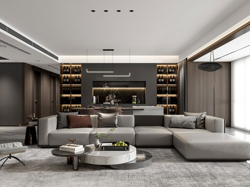 在沙发一侧靠墙设计展示型酒柜,搭配岛台餐桌,呈现开放式品茗区,也可做下午茶餐桌、或者临时工作桌等使用。