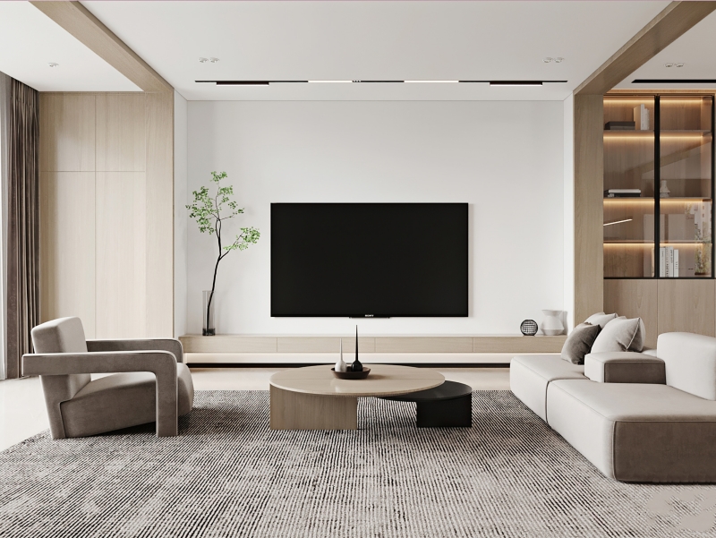 客厅电视背景墙没有进行太多的装饰,注重功能性与美观性,简洁的色调中透露出雅致的空间氛围感。在快节奏的社会生活中得到心灵上的放松,惬意的感受生活的美好与放松。