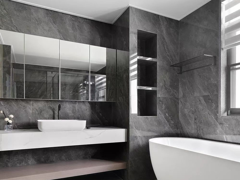 卫生间整体采用深色大理石材质作为基底,悬空设计洗手台时尚感十足,隐藏式镜面收纳柜提升空间实用性。