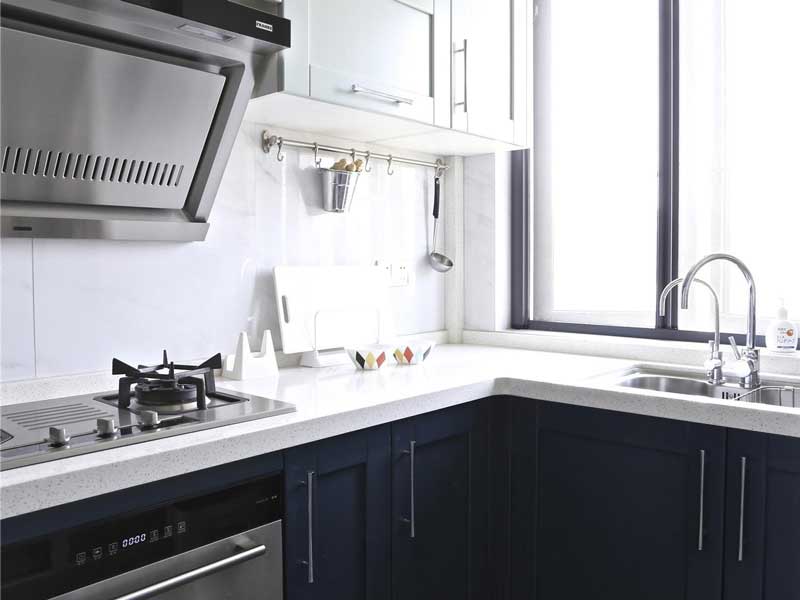 厨房区域蓝白配色,品质感十足,上浅下深的设计整体更显稳重,多面橱柜布局带来充足的收纳空间。