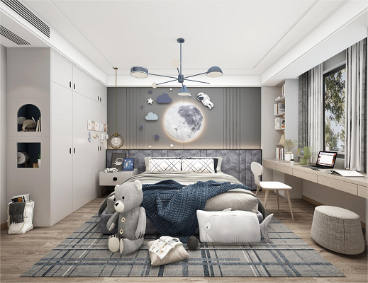 以蓝、白、灰三种色调为基础,适当的在墙面上加入太空人、星空等,既好看还可以激发孩子的想象力与创造力。