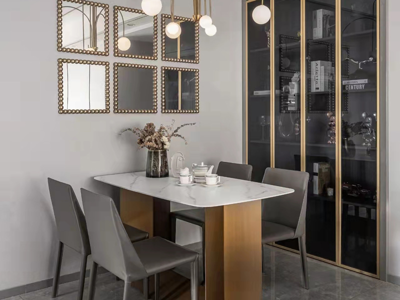 靠墙设计装饰镜面,视觉上延伸空间,上方一盏造型独特的吊灯垂落,为用餐区域增添温馨氛围。