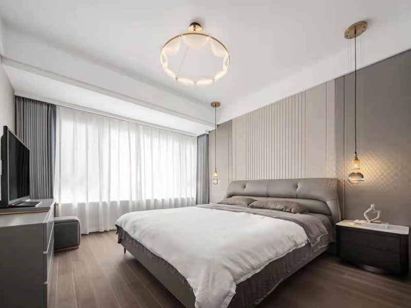 床头背景墙采用灰调护墙板设计,搭配柔软舒适的布艺床品,尽显舒适与质感,线条简洁静谧和谐。
