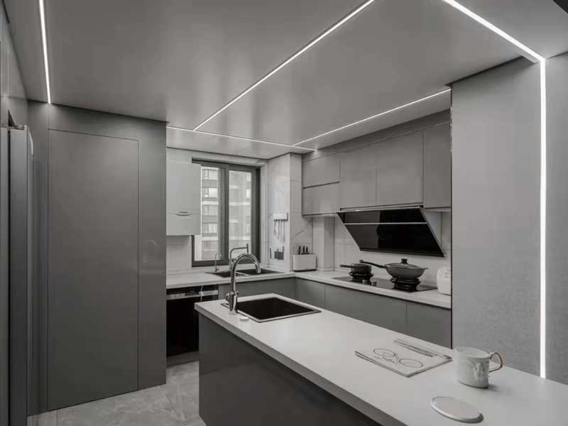 灰色橱柜门搭配白色大理石台面,简洁又耐脏,电器均采用嵌入式设计,让整体视觉更整洁统一。