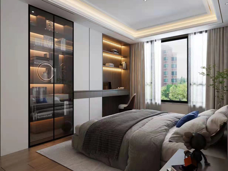 深色木质柜体搭配玻璃柜门,内置灯光设计,提升区域氛围感,时尚且便于取用,方便日常穿搭挑选。